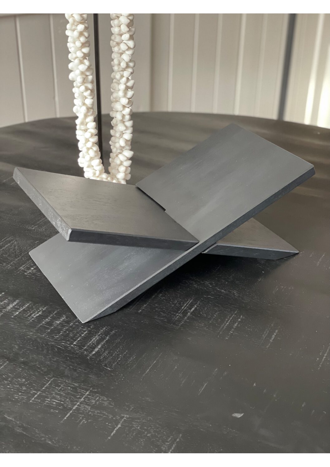 De boekenstandaard bestaat uit twee delen en is gemakkelijk in elkaar te zetten. Houd de delen vast met de viltjes naar beneden. Laat de inkepingen naar elkaar wijzen en schuif de delen voorzichtig in elkaar.